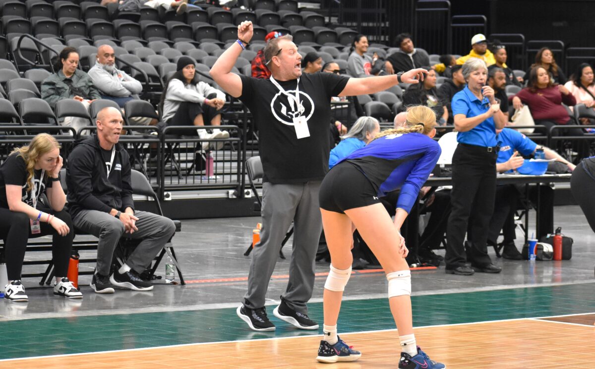 - Former Lone Peak girls volleyball coach Reed Carlson, now at Bingham, demonstrates a swing for one of his players during a 6A state semifinal final match against his former team at the UCCU Center on Saturday, Nov. 4, 2023.