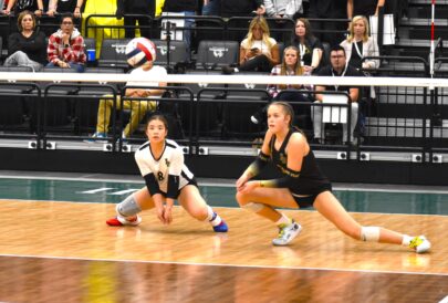 - Lone Peak’s Trinidy Tien, left, and Ava Burgess reach go to the floor for a pass during a 6A girls volleyball state semifinal match against Bingham at the UCCU Center on Saturday, Nov. 4, 2023.