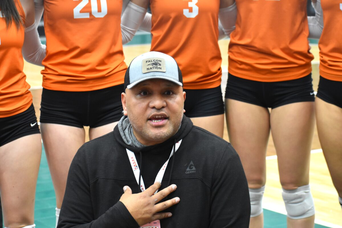 - Skyridge coach Silver Fonua addresses his team in a huddle during a 6A girls volleyball state semifinal match against Corner Canyon at the UCCU Center on Saturday, Nov. 4, 2023.