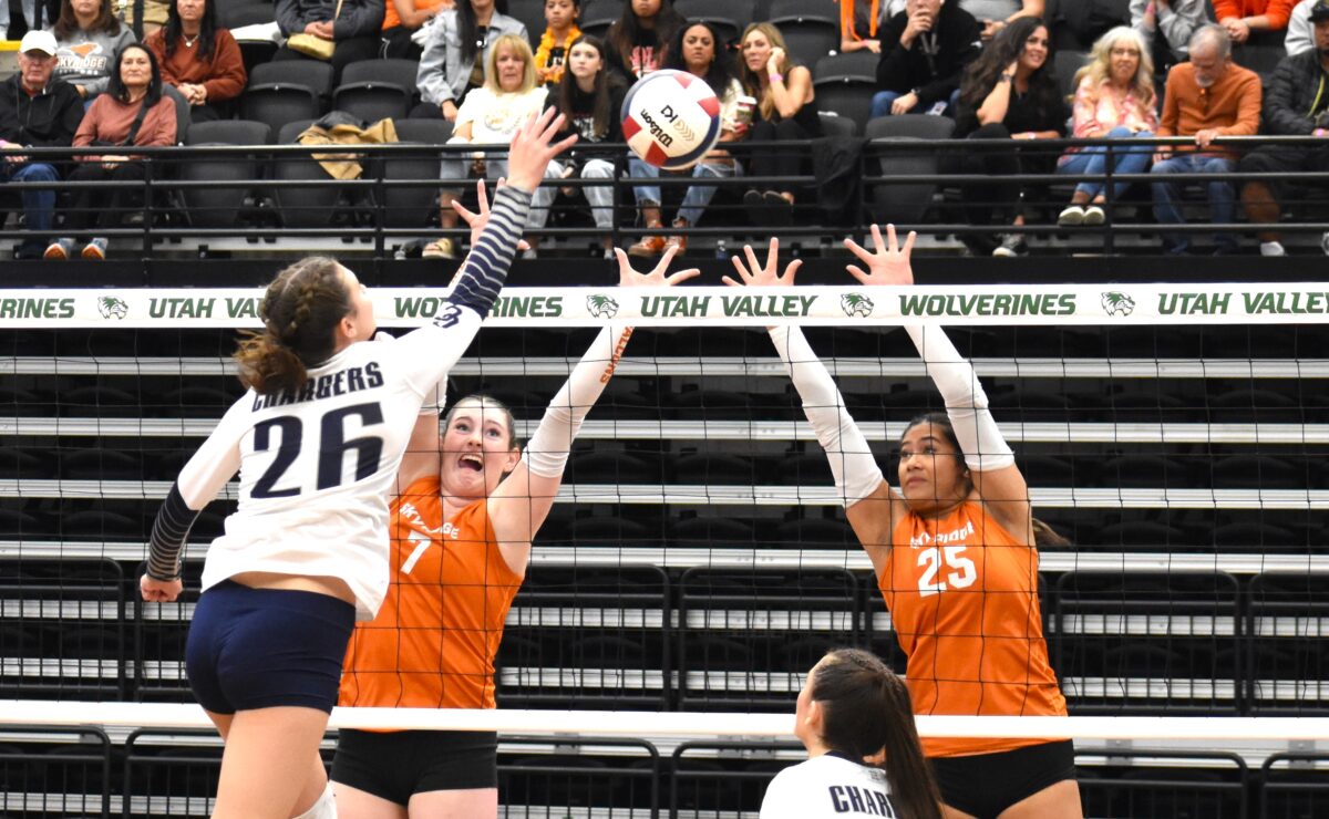 - Elle McCandless (7) and Neriah Perez put up a block against Corner Canyon in a 6A girls volleyball semifinal match at the UCCU Center on Saturday, Nov. 4, 2023.