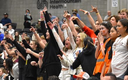 - Skyridge volleyball fans react to a play during a 6A girls volleyball semifinal match against Corner Canyon at the UCCU Center on Saturday, Nov. 4, 2023.