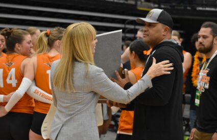 - Skyridge coach Silver Fonua accepts the runner-up trophy at the 6A girls volleyball state championships at the UCCU Center on Saturday, Nov. 4, 2023.
