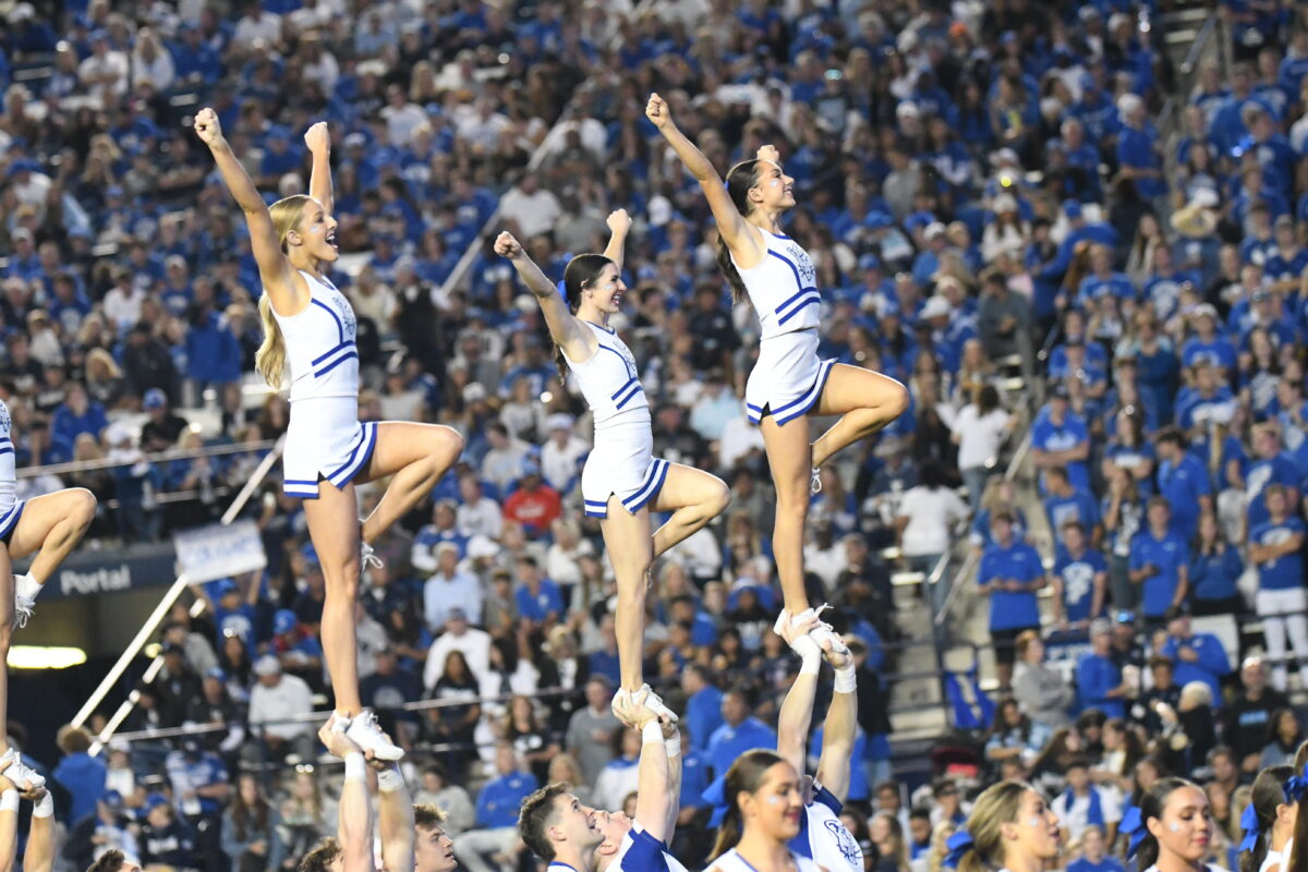 - BYU cheerleaders perform for the crowd during the Big 12 game against Texas Tech at LaVell Edwards Stadium in Provo on Saturday, Oct. 21, 2023.