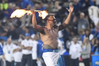 - Fire-knife dancers perform for the crowd during the Big 12 game against Texas Tech at LaVell Edwards Stadium in Provo on Saturday, Oct. 21, 2023.