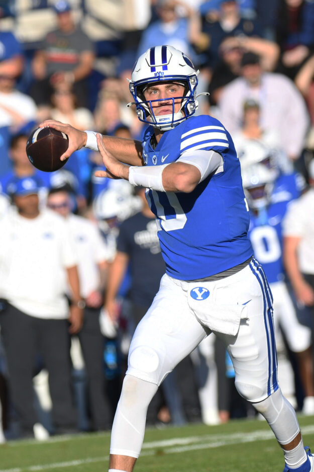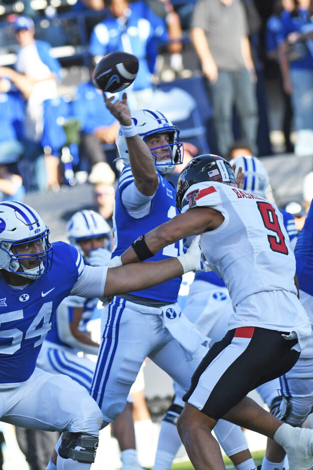 - BYU senior quarterback Kedon Slovis throws a pass during the Big 12 game against Texas Tech at LaVell Edwards Stadium in Provo on Saturday, Oct. 21, 2023.