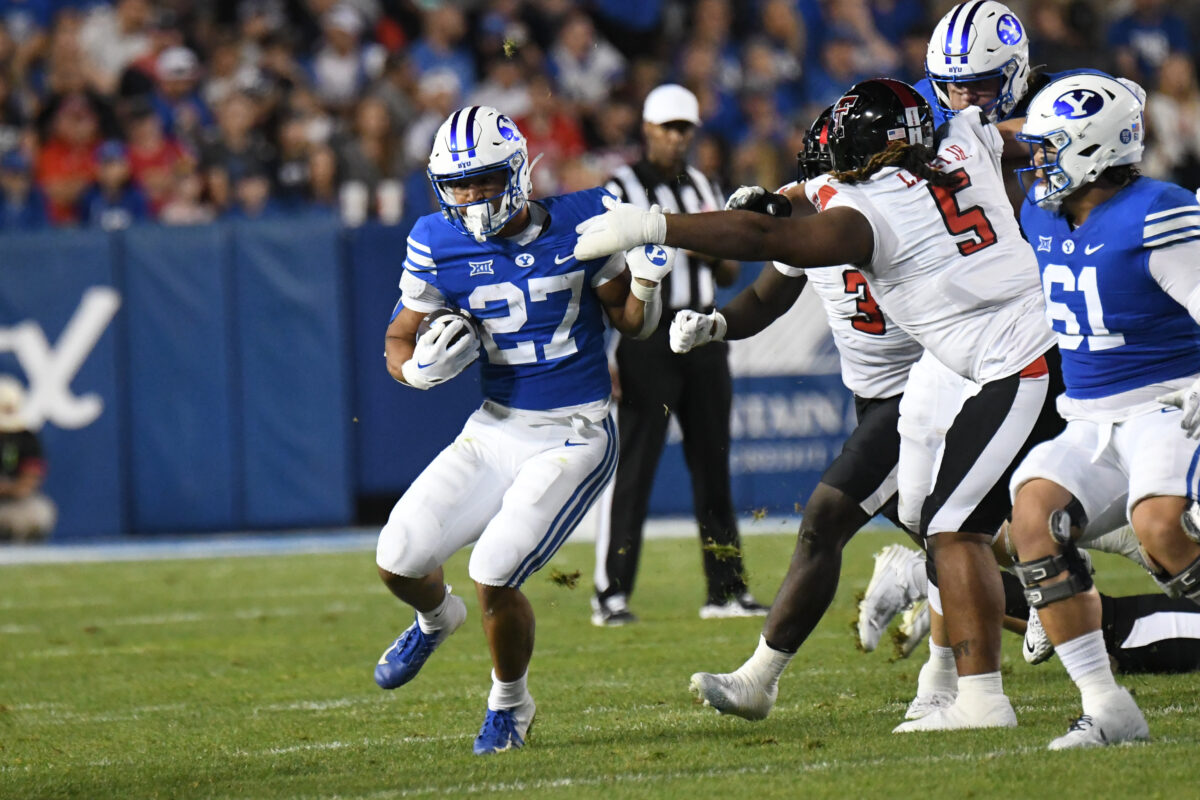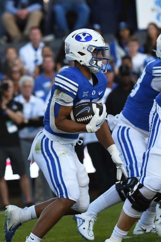 - BYU senior running back Deion Smith runs the ball during the Big 12 game against Texas Tech at LaVell Edwards Stadium in Provo on Saturday, Oct. 21, 2023.