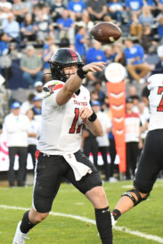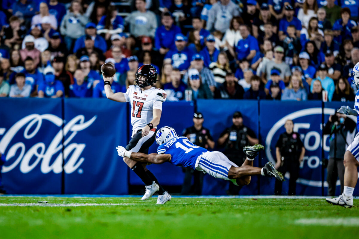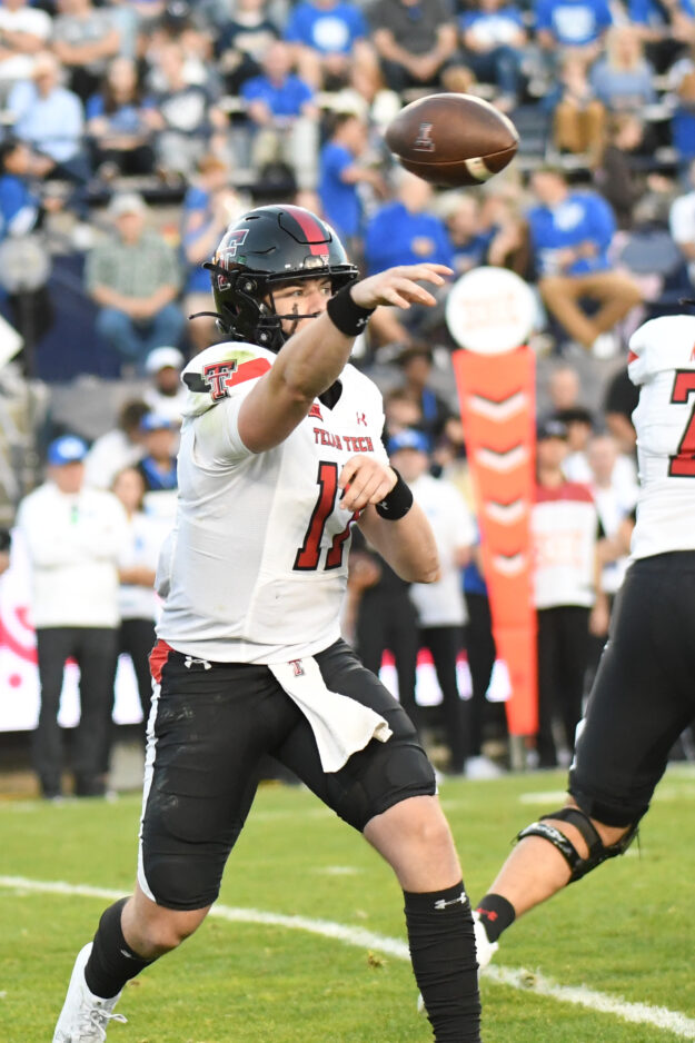 - Texas Tech freshman quarterback Jake Strong throws a pass during the Big 12 game against BYU at LaVell Edwards Stadium in Provo on Saturday, Oct. 21, 2023.