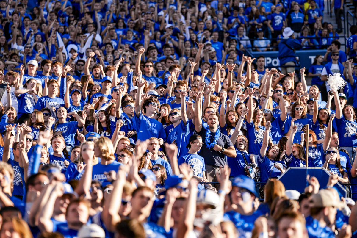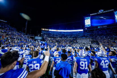 - BYU fans celebrate with junior defensive back Jakob Robinson after the Big 12 game against Texas Tech at LaVell Edwards Stadium in Provo on Saturday, Oct. 21, 2023.