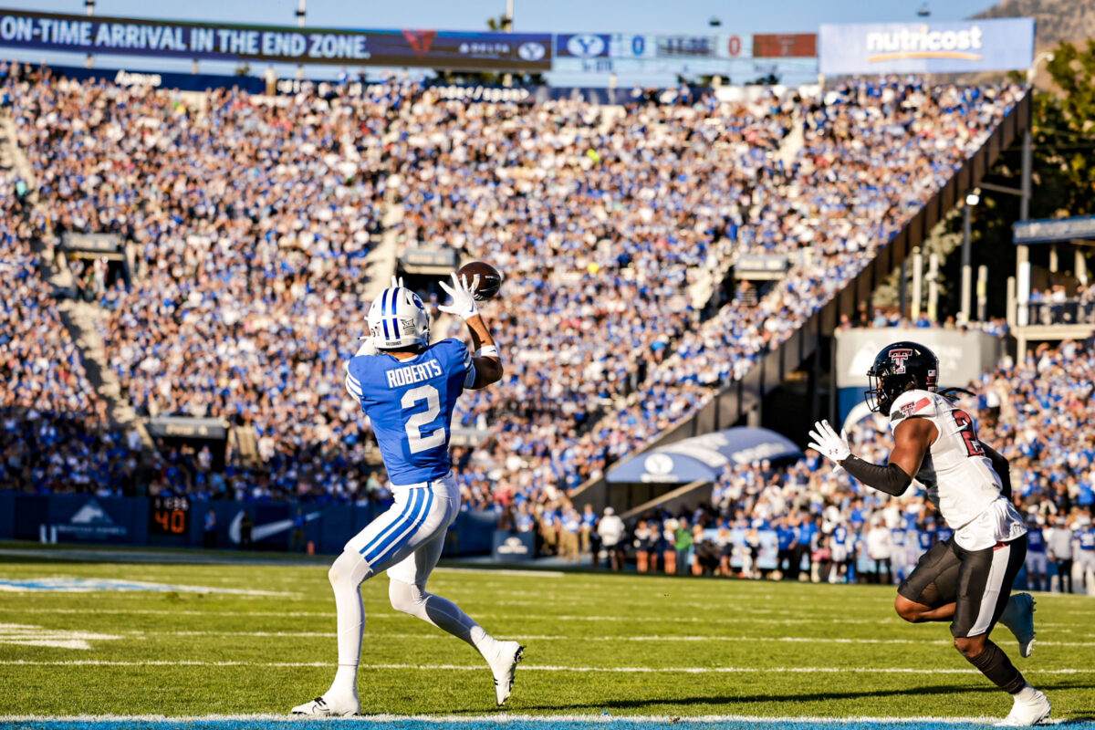 - BYU sophomore wide receiver Chase Roberts catches a touchdown pass during the Big 12 game against Texas Tech at LaVell Edwards Stadium in Provo on Saturday, Oct. 21, 2023.