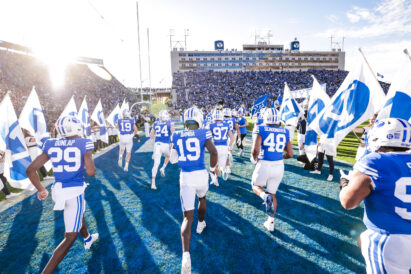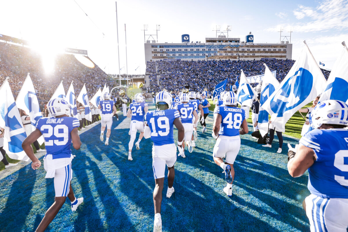 - BYU football players take the field before the Big 12 game against Texas Tech at LaVell Edwards Stadium in Provo on Saturday, Oct. 21, 2023.