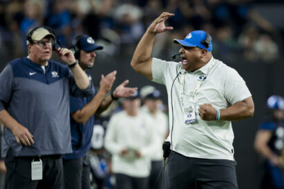 - BYU head coach Kalani Sitake celebrates a big play during the game against Notre Dame at Allegiant Stadium in Las Vegas on Saturday, Oct. 8, 2022.