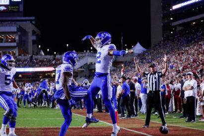 BYU sophomore wide receiver Chase Roberts celebrates after making a touchdown catch during the game against Arkansas at Donald W. Reynolds Razorback Stadium in Fayetteville, Arkansas, on Saturday, Sept. 17, 2023.