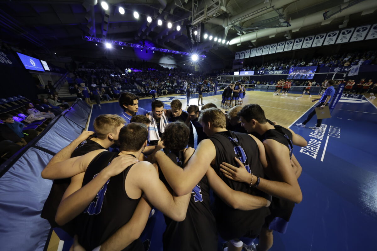 - The BYU men’s volleyball team huddles before the start of a match against Ball State at the Smith Fieldhouse on Friday, Jan. 5, 2024.
