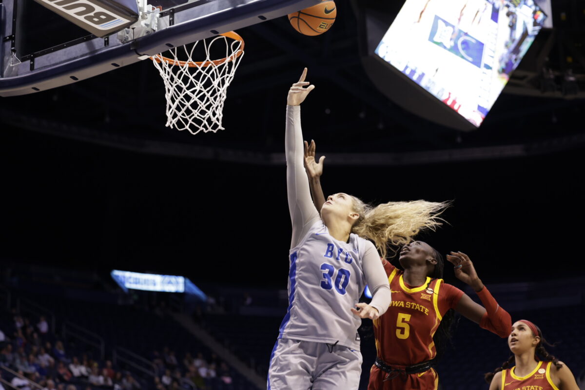 - BYU’s Lauren Davenport drives in for a layup against Iowa State in a Big 12 women’s basketball game at the Marriott Center on Saturday, Jan. 6, 2024.