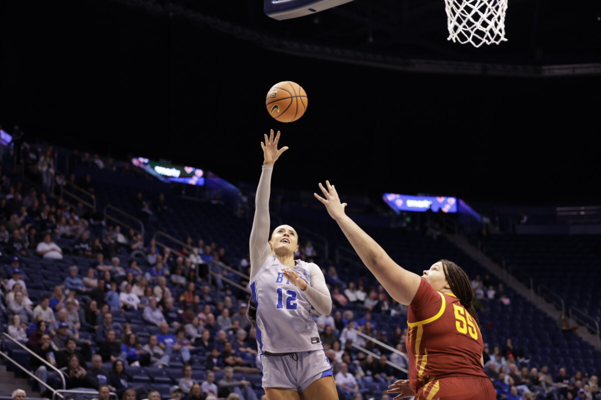 - BYU’s Lauren Gustin (12) goes to the basket against Iowa State’s Audi Crooks during a Big 12 women’s basketball game at the Marriott Center on Saturday, Jan. 6, 2024.