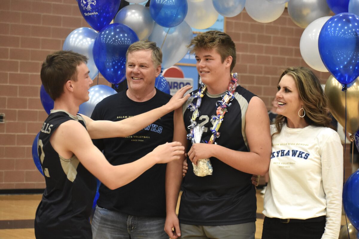 - Jaxson Cowley, center, of Salem Hills is honored on Senior Night before a Region 7 match against Maple Mountain in Tuesday, May 7, 2024.