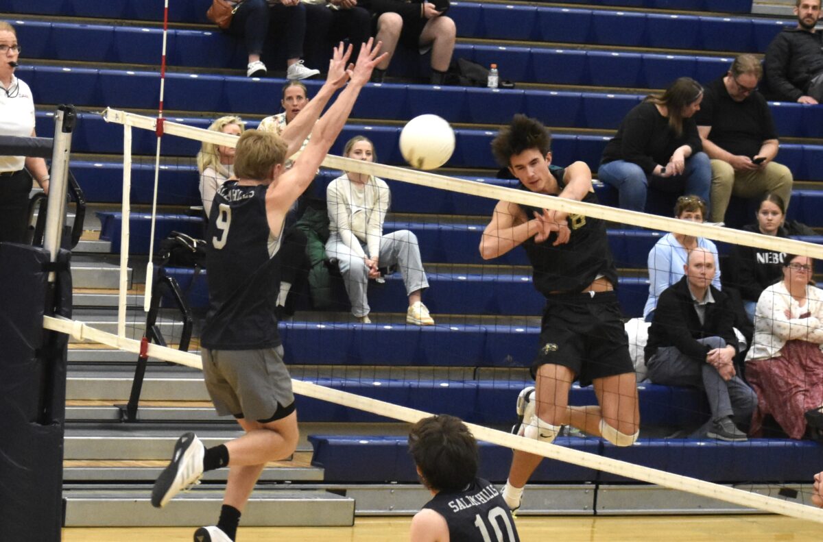 - Maple Mountain’s Trey Thornton, right, takes a swing in a Region 7 boys volleyball match against Salem Hills on Tuesday, May 7, 2024.