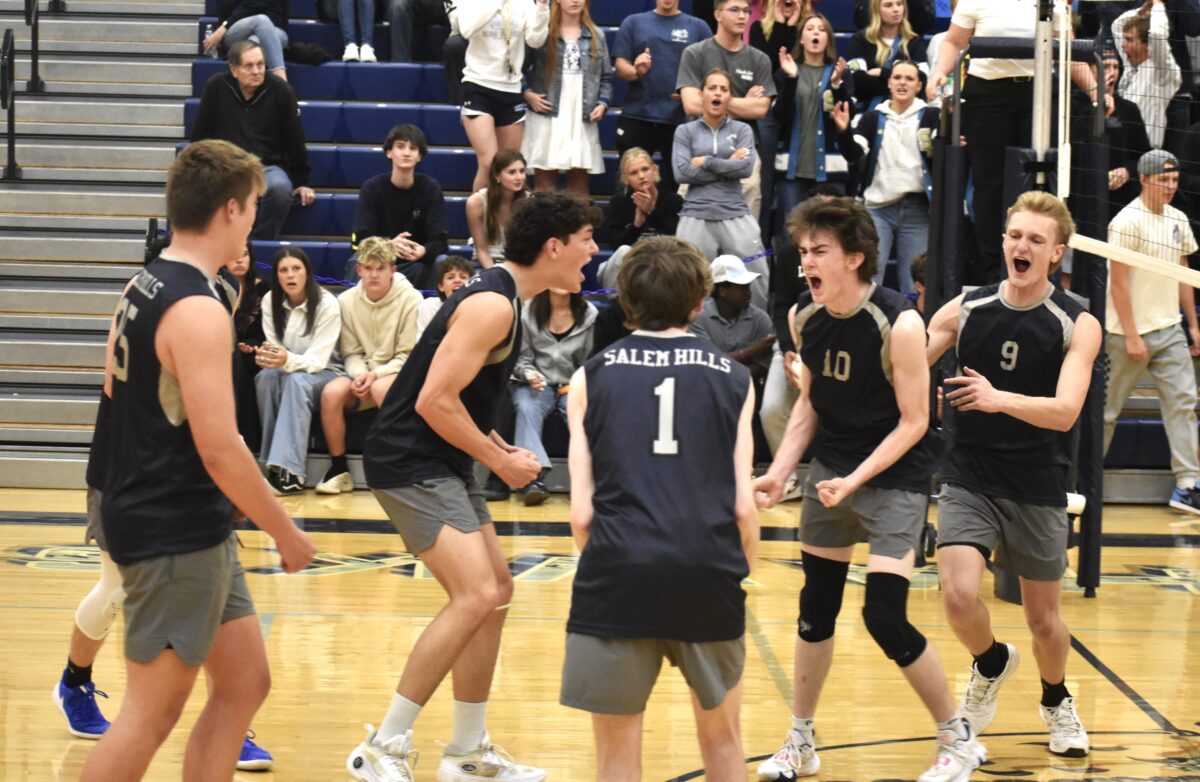 - The Salem Hills boys volleyball team celebrates a point during a Region 7 match against Maple Mountain on Tuesday, May 7, 2024.