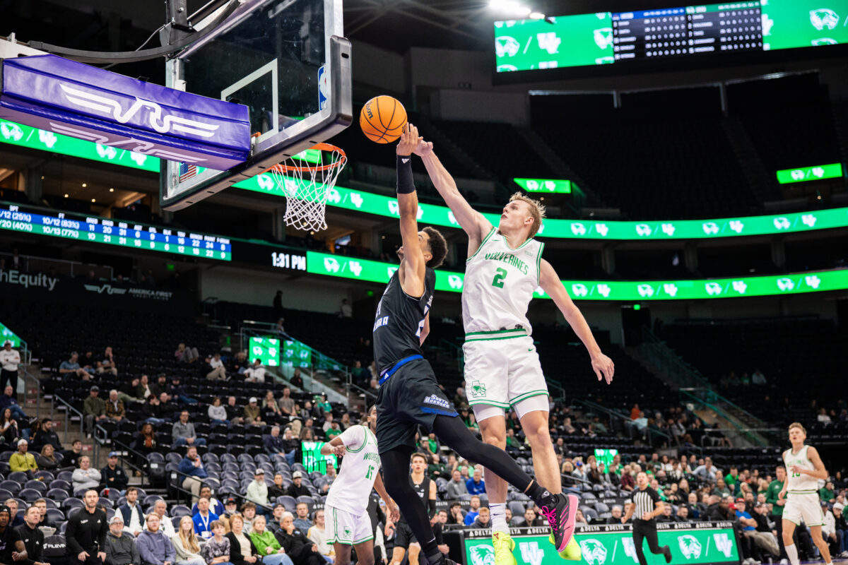 - UVU’s Jackson Holcombe blocks a shot at the rim during his team’s 68-53 win over UC Santa Barbara on Saturday. December 13, 2025