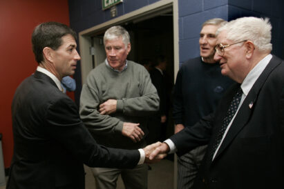 - Former Utah Jazz guard John Stockton, left, greets his former coaches Gonzaga’s Dan Fitzgerald and Utah Jazz’s Jerry Sloan and Frank Layden, left to right, at the start of a news conference prior to the retirement of his jersey Monday, Nov. 22, 2004, in Salt Lake City.