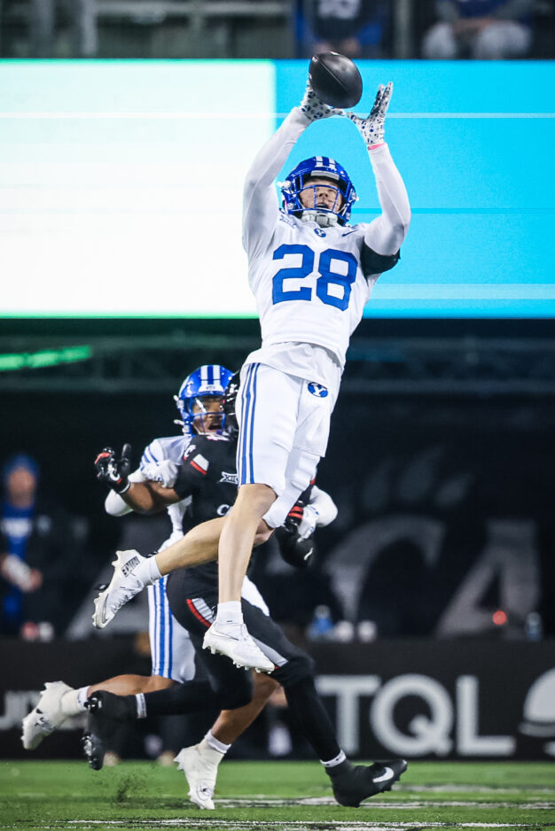 - BYU safety Tanner Wall leaps up high to pull down a key interception during the Cougar’s 26-14 win over Cincinnati. November 22, 2025
