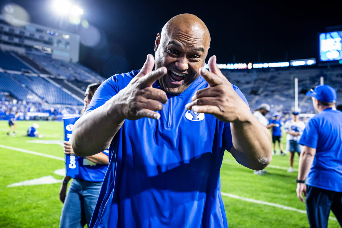 - BYU defensive line Coach Sione Po’uha celebrates following the Cougar’s win over Portland State