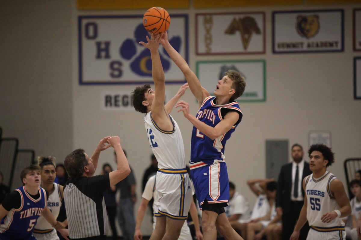 - Timpview’s Will Openshaw and Orem’s Simeon Suguturaga battle for the tip-off in a game on Friday, Jan. 9, 2026, in Orem.