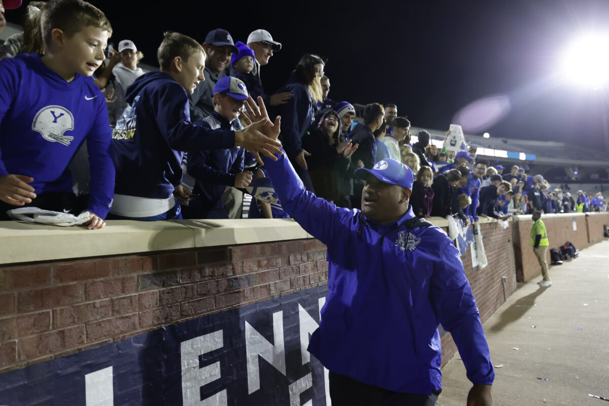 - BYU head coach Kalani Sitake high-fives fans after the 34-17 Cougar win over Georgia Southern at Paulson Stadium in Statesboro, Georgia, on Saturday, Nov. 20, 2021. (Courtesy BYU Photo)