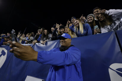 - BYU head coach Kalani Sitake takes a selfie with some Cougar fans after a 66-49 victory against Virginia on Saturday, Oct. 30, 2021. (BYU Courtesy Photo)