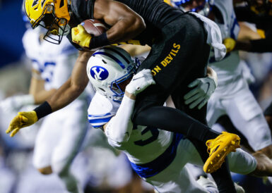 - BYU’s Talmage Gunther forces a fumble during the 27-17 Cougar win over Arizona State at LaVell Edwards Stadium in Provo on Saturday, Sept. 18, 2021. (Courtesy BYU Photo)