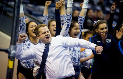 Brigham Young University head gymnastics coach Guard Young cheers after Abby Boden Stainton completed her uneven bars routine during BYU’s season-opening gymnastics meet against the University of Nebraska held Monday, Jan. 6, 2020, at the Marriott Center in Provo. Isaac Hale, Daily Herald
