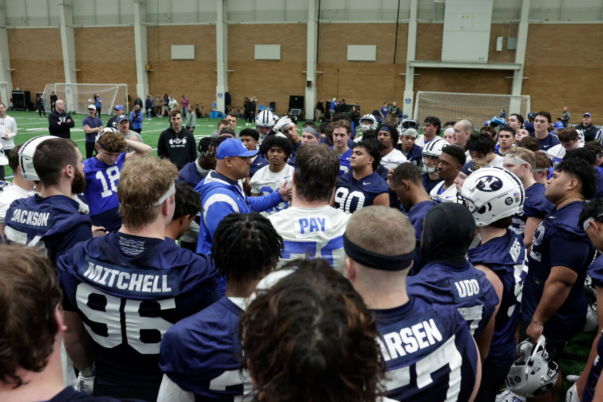 - BYU head coach Kalani Sitake talks to his team at the conclusion of the first day of 2023 spring camp at the indoor practice facility in Provo on Monday, March 6, 2023.