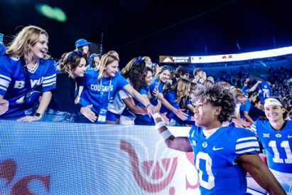 - BYU fans celebrate with junior defensive back Jakob Robinson after the Big 12 game against Texas Tech at LaVell Edwards Stadium in Provo on Saturday, Oct. 21, 2023.