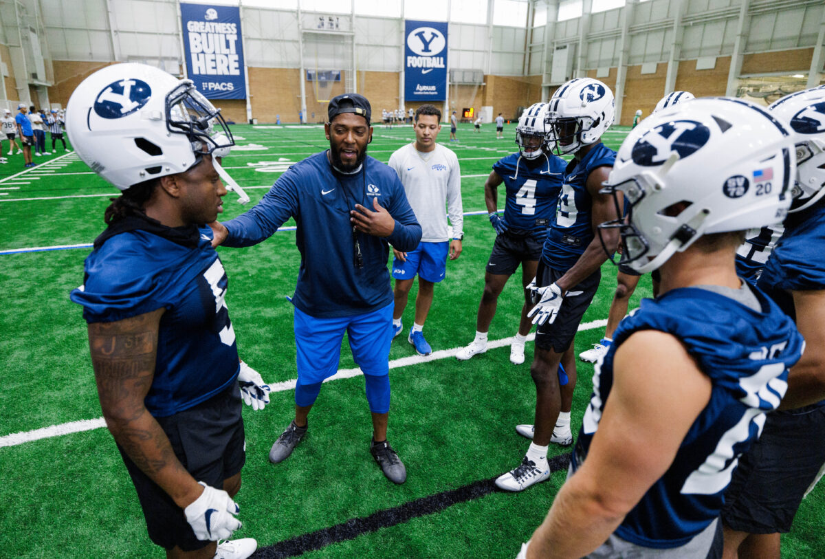 - BYU cornerbacks coach Jernaro Gilford (left) talks to his guys during practice in Provo on Thursday, March 14, 2024.