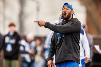 - BYU cornerbacks coach Jernaro Gilford watches a drill during the first day of 2023 spring camp at the indoor practice facility in Provo on Monday, March 6, 2023.