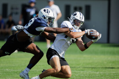 - BYU junior cornerback Mory Bamba (left) defends a pass to a wide receiver during fall camp in Provo on Friday, Aug. 2, 2024.