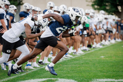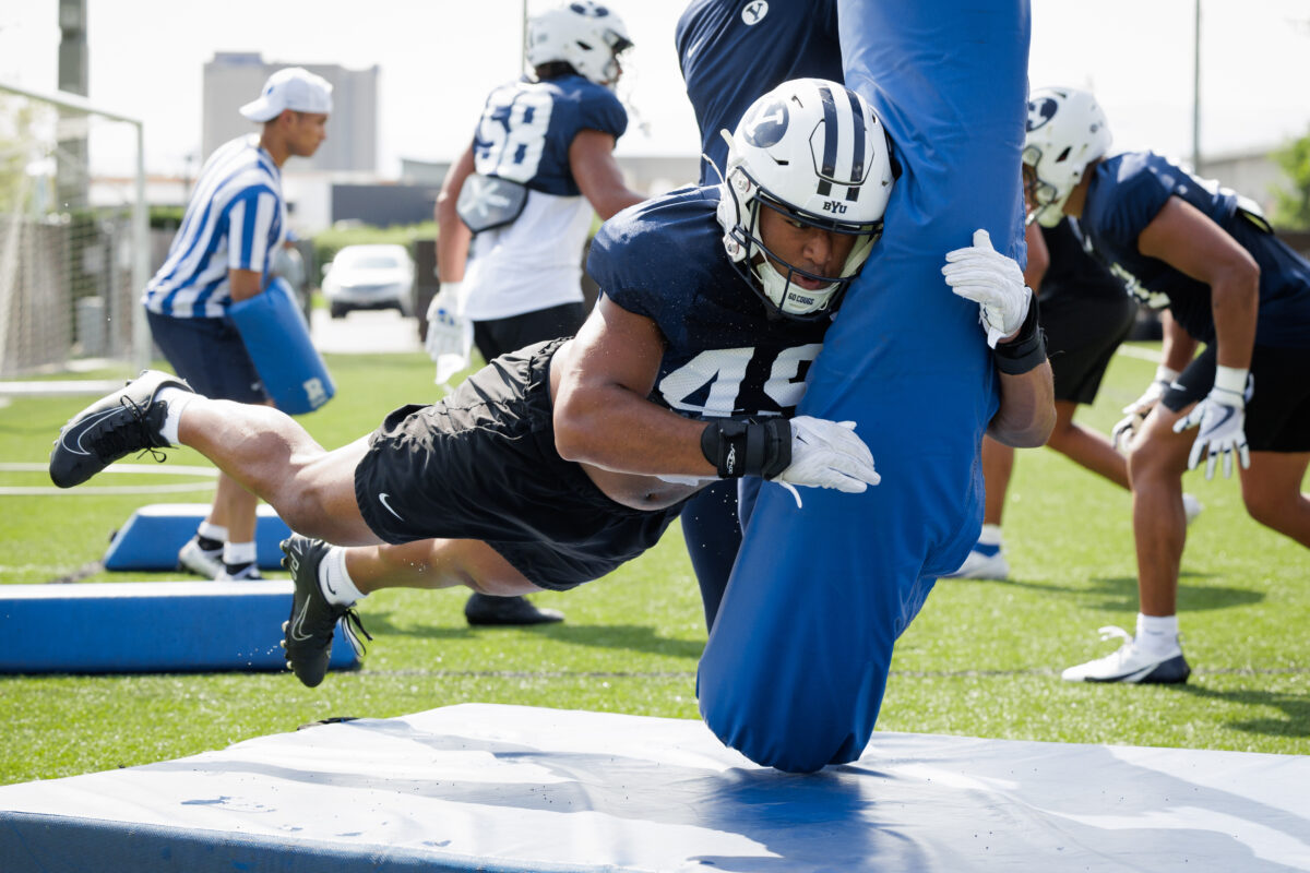 - BYU defenders run a drill during practice in Provo on Monday, Aug. 5, 2024.