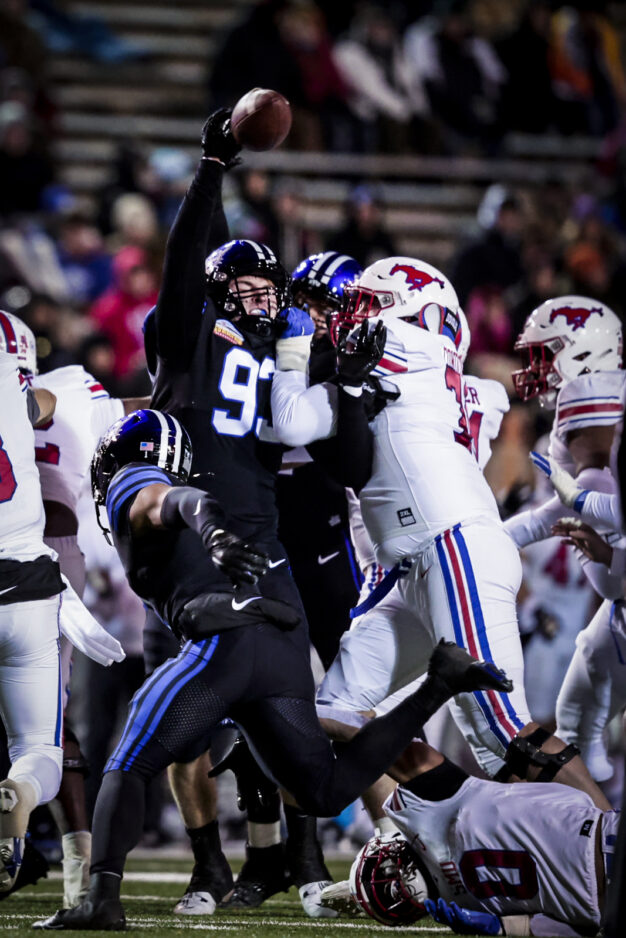 - BYU sophomore defensive lineman Blake Mangelson knocks down a pass during the New Mexico Bowl game against SMU at University Stadium in Albuquerque, N.M., on Saturday, Dec. 17, 2022.