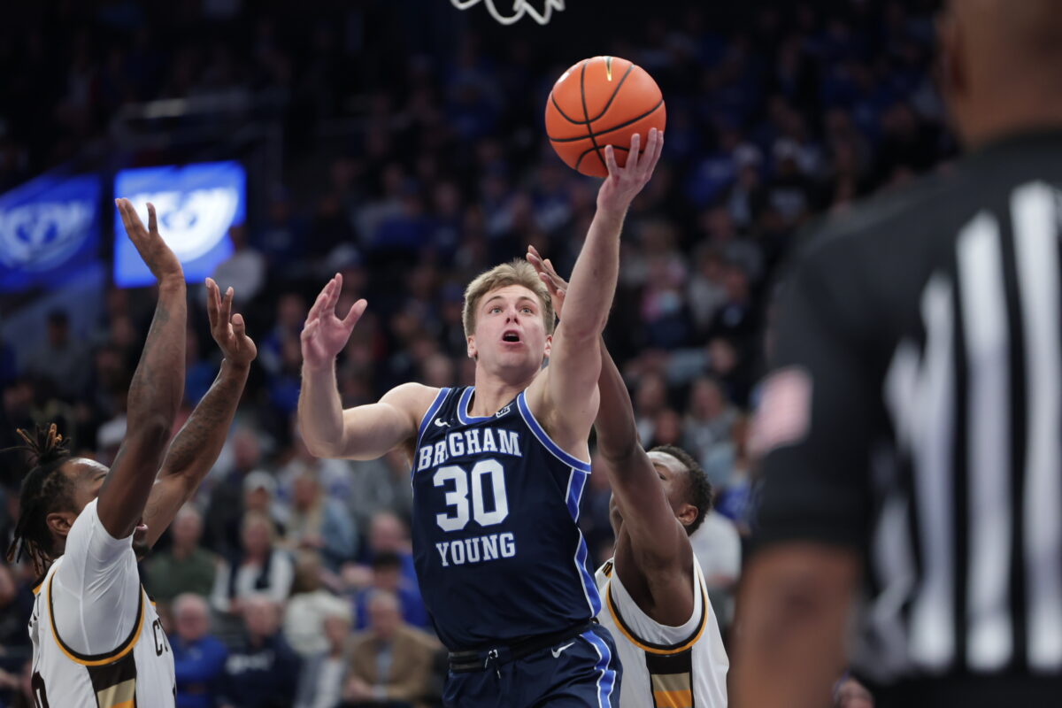 - BYU’s Dallin Hall drives to the basket against Wyoming in a men’s college basketball game at the Delta Center in Salt Lake City on Saturday, Dec. 14, 2024.