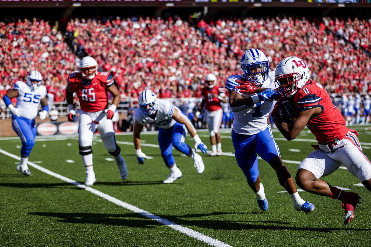 - BYU safety Micah Harper attempts to make a tackle during the game against Liberty at Williams Stadium in Lynchburg, Virginia, on Saturday, Oct. 23, 2022.
