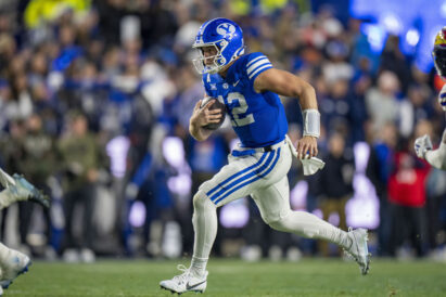 - BYU junior quarterback Jake Retzlaff carries the ball during the Big 12 game against Kansas at LaVell Edwards Stadium in Provo on Saturday, Nov. 16, 2024.