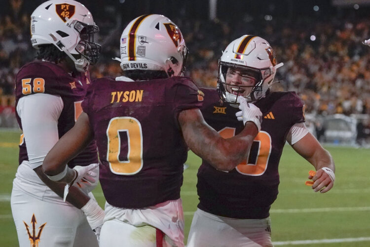 Arizona State wide receiver Jordyn Tyson (0), left, celebrates his touchdown with his quarterback Sam Leavitt, right, during a NCAA college football game against Central Florida Saturday, Nov. 9, 2024, in Tempe, Ariz.Each week the Daily Herald will provide five true facts about BYU’s latest football opponent for your enjoyment. This week, Arizona State.