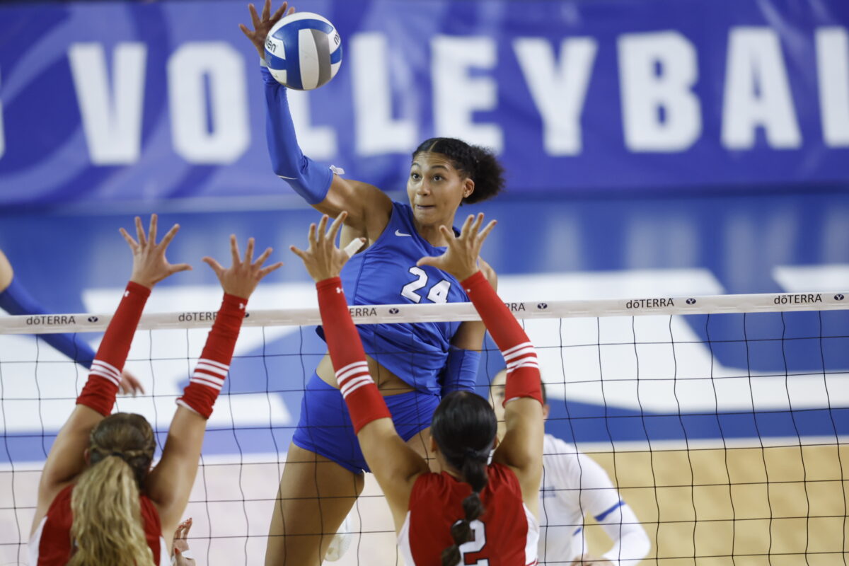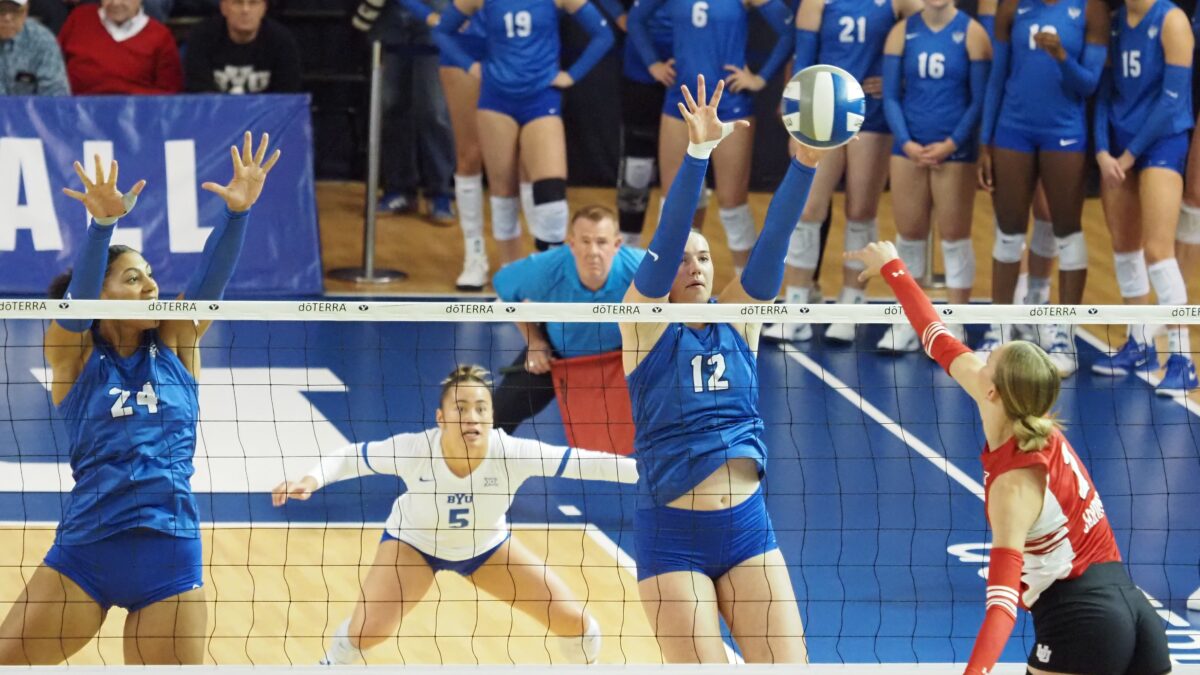 A bad pass led to an easy Utah point and a 10-7 deficit in the fifth set, but the Cougars stayed strong and eventually tied the set at 11 on a combo block from Blaykli Bobik and Kjersti Strong.