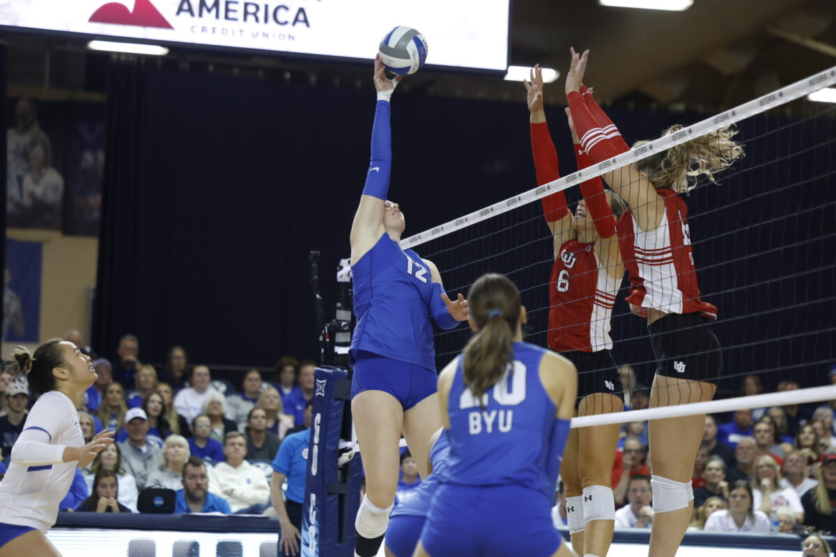 - A BYU player hits the ball during the Big 12 match against Utah at the Smith Fieldhouse in Provo on Saturday, Oct. 19, 2024.