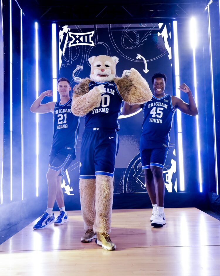 - BYU men’s basketball players Trevin Knell (21) and Fousseyni Traore posed with mascot Cosmo the Cougar during Big 12 Media Day at T-Mobile Center in Kansas City, Mo., on Wednesday, Oct. 23, 2024.