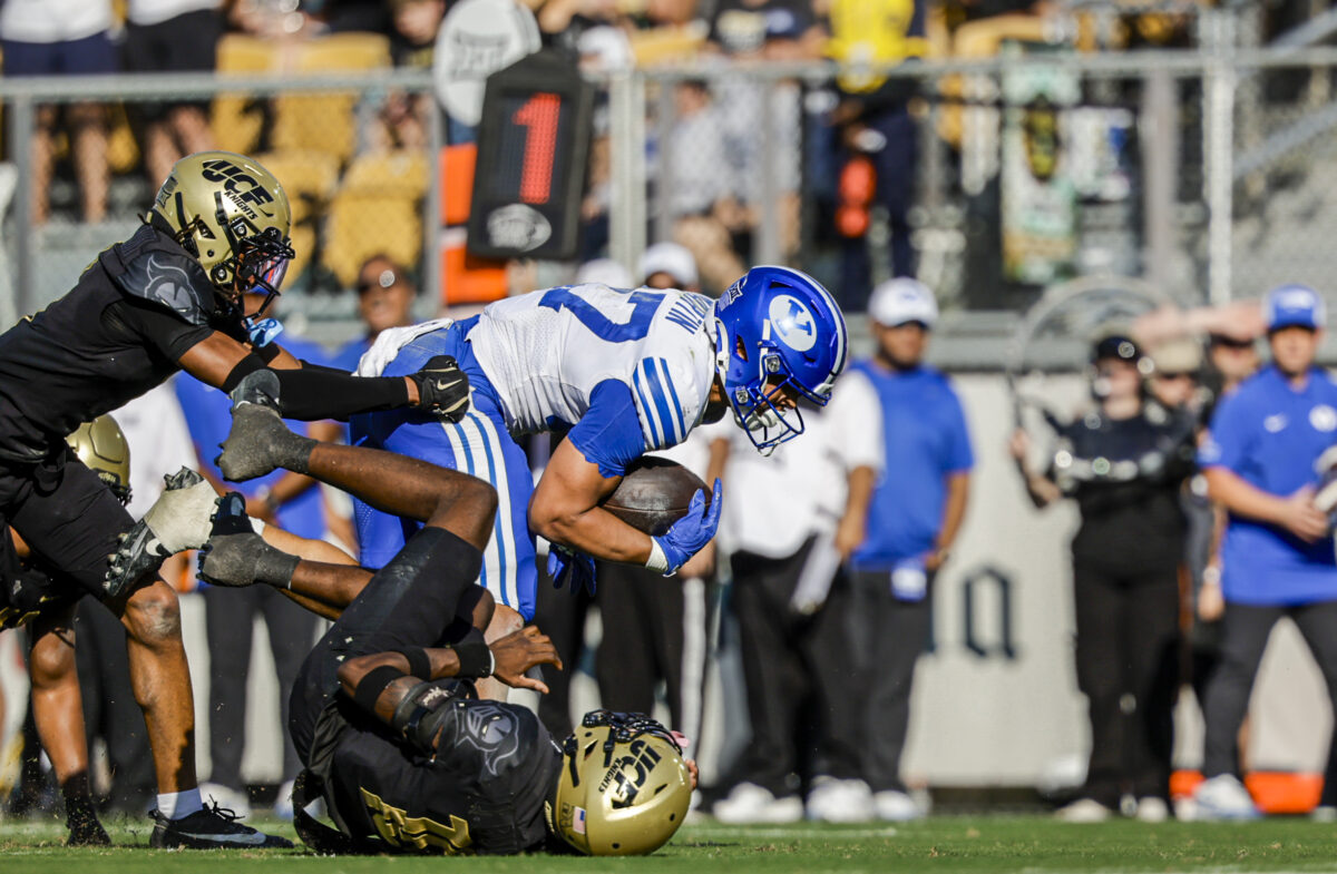 - BYU linebackers Aisea Moa (58) and Isaish Glasker make a tackle during the Big 12 game against UCF at FBC Mortgage Stadium in Orlando on Saturday, Oct. 26, 2024.
