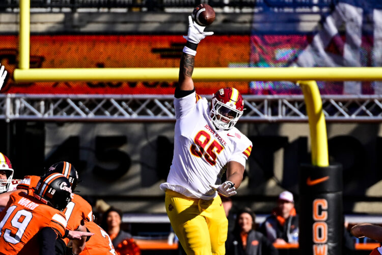 Iowa State defensive lineman Domonique Orange (95) attempts to block a kick against the Oklahoma State during the second half of an NCAA college football game, Saturday, Nov. 29, 2025, in Stillwater, Okla.Iowa State and Kansas State, which both replaced head coaches in the past week, declined to play in bowl games.