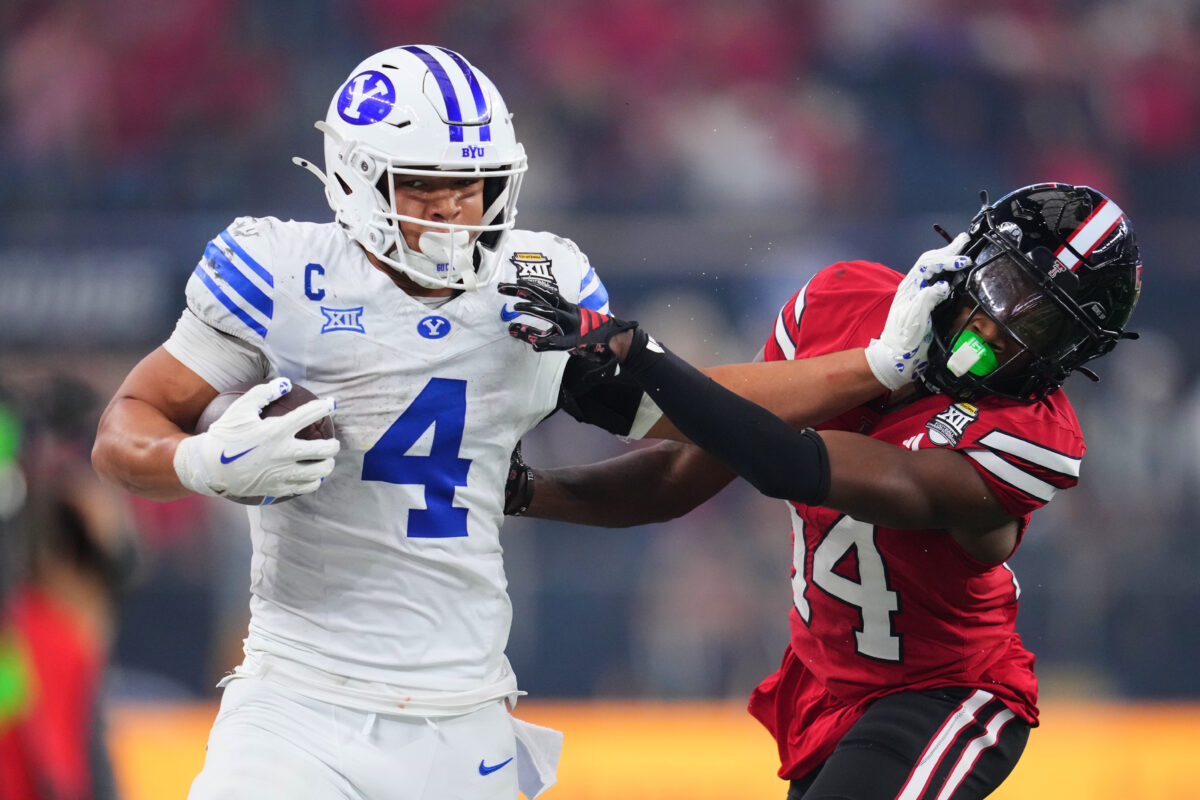 - BYU running back LJ Martin (4) is stopped after making a catch by Texas Tech cornerback Brice Pollock (14) in the second half of a Big 12 Conference championship NCAA college football game Saturday, Dec. 6, 2025, in Arlington, Texas.