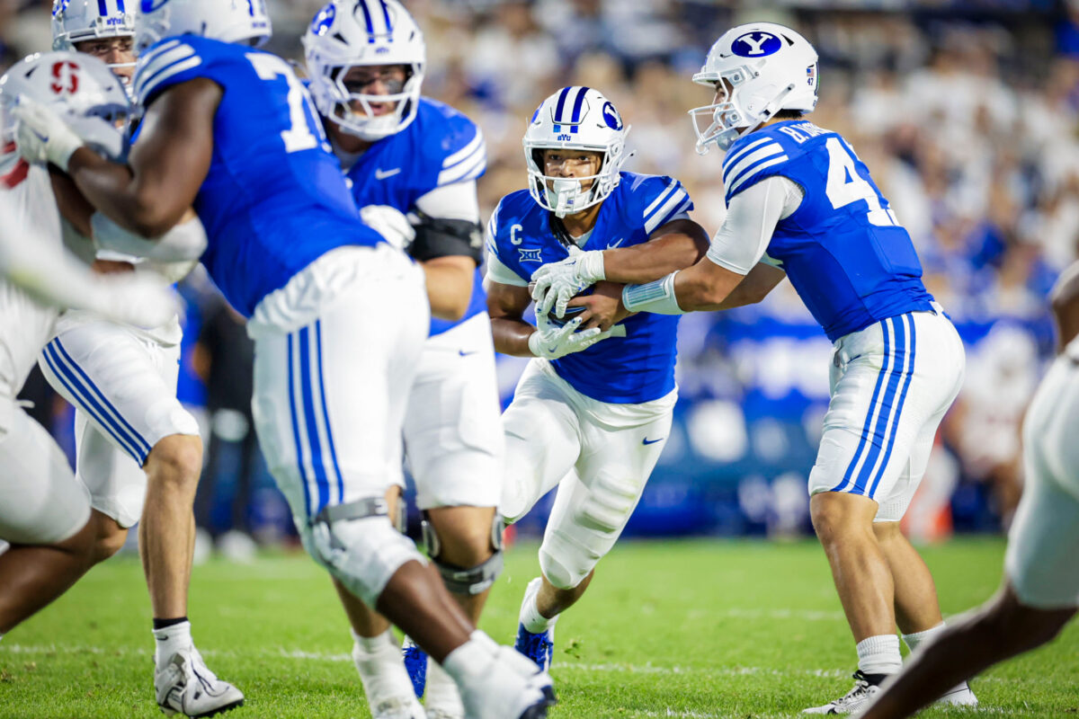 - BYU’s LJ Martin carries the ball against Stanford at LaVell Edwards Stadium on Saturday, Sept. 6, 2025.