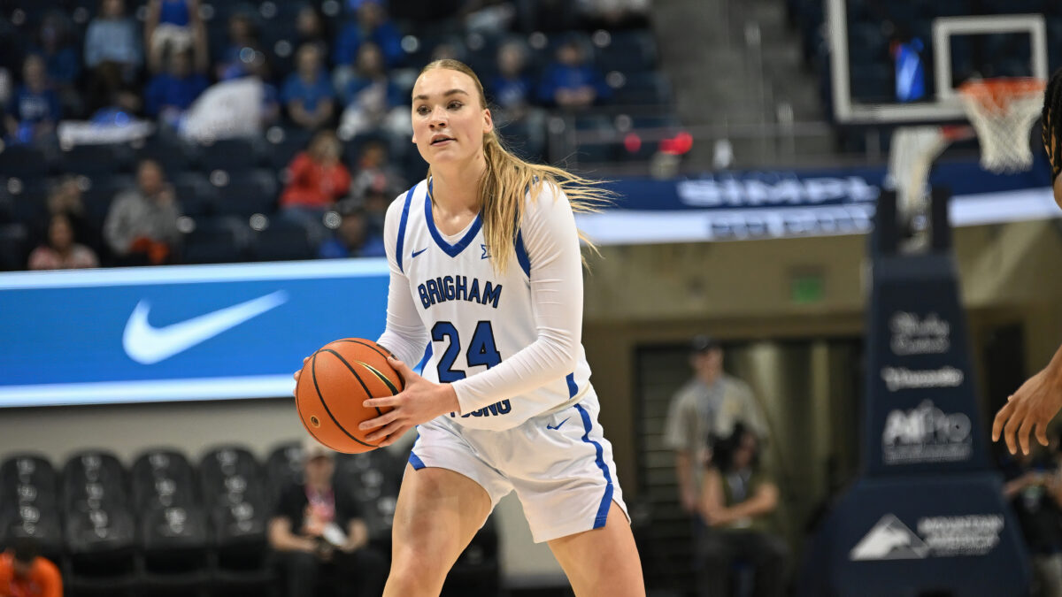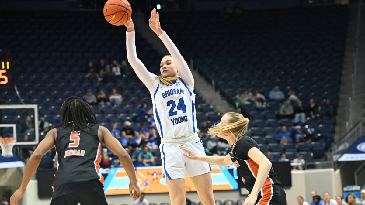 - BYU’s Brinley Cannon (24) passes the ball against Idaho State in a women’s college basketball game at the Marriott Center on Thursday, Dec. 11, 2025.